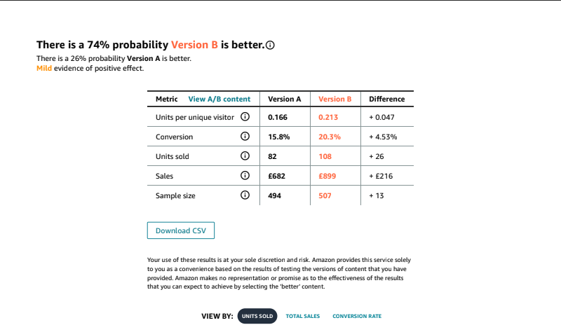 Version B showed a clear improvement over Version A across all key metrics. Units sold per unique visitor increased by 28.3%. The conversion rate improved from 15.8% to 20.3%, an increase of 28.5%. Total units sold rose from 82 to 108, reflecting a growth of 31.7%. Additionally, total sales revenue increased from £682 to £899, a growth of 31.7%. The results showed that there was a 74% chance that the new images (Version B) performed better than the old ones (Version A).